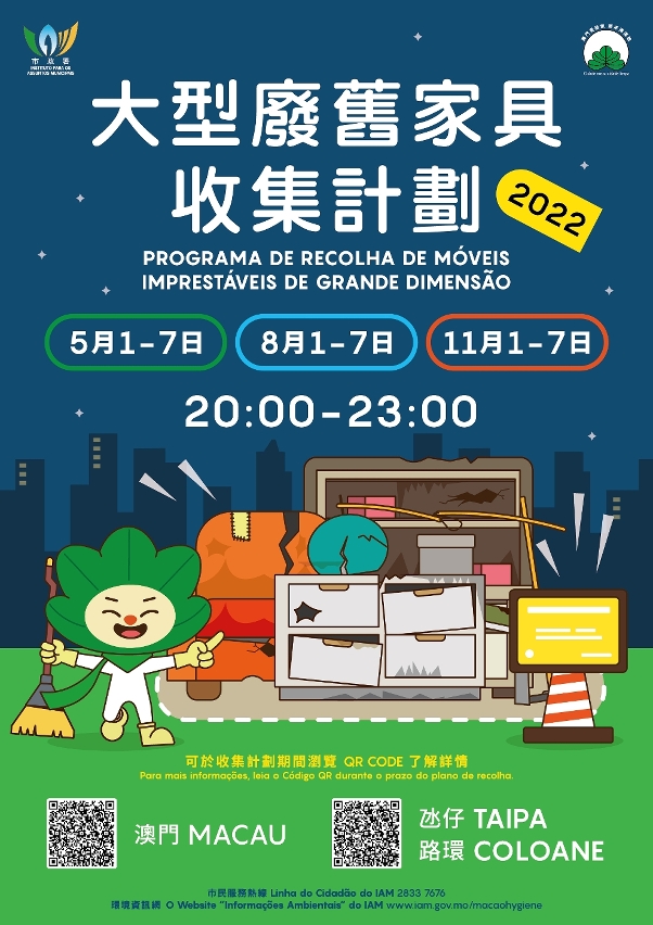 市民可于上述期间及时段将废旧家具弃置于指定的临时收集站内。各收集站均设有告示牌,以便市民识别,详细位置可参阅海报、市政署环境资讯网 www.iam.gov.mo/macaohygiene 或微信帐号,亦可致电市政署市民服务热线2833 7676查询。为免垃圾堆积,在设置收集站期间,市政署将协调外判公司加派人员及车辆,于当晚清运收集站内的废旧家具。