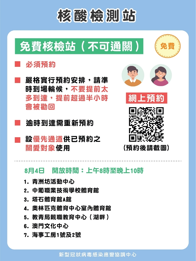 新型冠状病毒感染应变协调中心(下称应变协调中心)表示,为配合各类人群核酸检测,8月4日调整核酸检测站安排如下,全部站点必须预约,请前往核检人士留意: