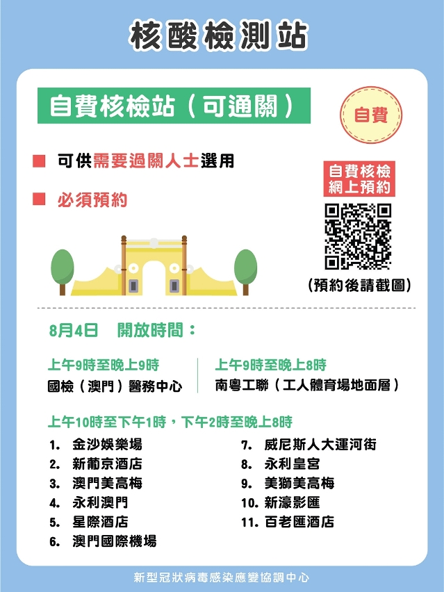 - 使用上述核酸检测站自费通道的人士,需使用自费核检站预约连结进行预约并付费,入站登记时出示预约截图,自费核检结果会上载澳门健康码及可用作通关。
