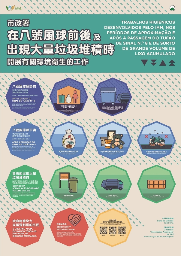 八号风球来临前,市政署会协调澳门清洁专营有限公司检查和加固垃圾收集设施,并提前收集垃圾。台风过后,市政署人员会即时巡查各区环境卫生情况,而澳门清洁专营有限公司则会增派人手和车队,加快清运垃圾。若灾情严重,市政署会在全澳六十个地点设置临时垃圾收集站,方便市民弃置垃圾。此外,若前线工作已超出负荷时,市政署会按照“市政署防灾减灾应变计划”,调配内部人员组成救灾支援梯队,协助低洼地区的清理善后工作。