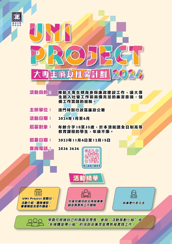 为致力推动大专生参与廉政建设,廉政公署持续深化与本澳大专院校合作,举办“UNI Project─大专生廉政推广计划2024”。活动名称中的UNI是英文University and Integrity的缩写。廉署期望透过一系列培训和倡廉实践工作,让大专生在踏入社会工作前提高廉洁意识,累积工作实践的经验。活动由即(6)日起至2023年12月15日招募学员,欢迎18至35岁正就读本澳全日制高等教育课程的学生报名参加。