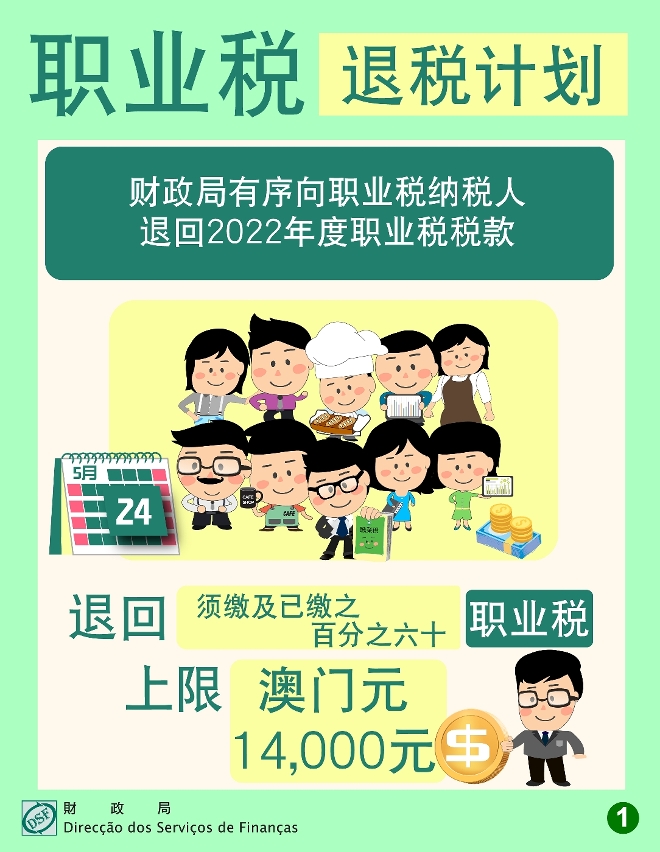 根据第22/2023号法律《2024年财政年度预算案》第二十条的规定,向2022年12月31日持有澳门居民身份证的职业税纳税人,退回2022年度须缴并已缴纳的职业税税款百分之六十,上限为澳门元14,000元。