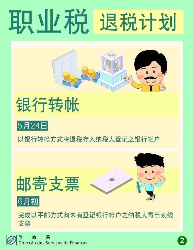 财政局将于5月24日以银行转帐或邮寄划线支票方式向2022年12月31日持有澳门居民身份证的职业税纳税人发放退税款项,将有15.8万名纳税人获得退税。