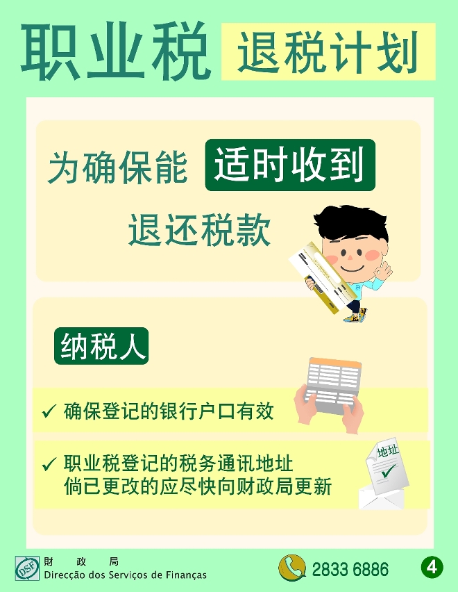 财政局提醒,由于职业税退税款是透过银行转帐或邮寄划线支票方式发放,纳税人应检视登记银行转帐的银行帐户的有效性,又或倘在财政局职业税登记的税务通讯地址已作出更改,纳税人应尽快更新税务通讯地址,以确保可适时收取职业税退税款。有关银行转帐帐户资料或税务通讯地址,可透过上述渠道查阅。