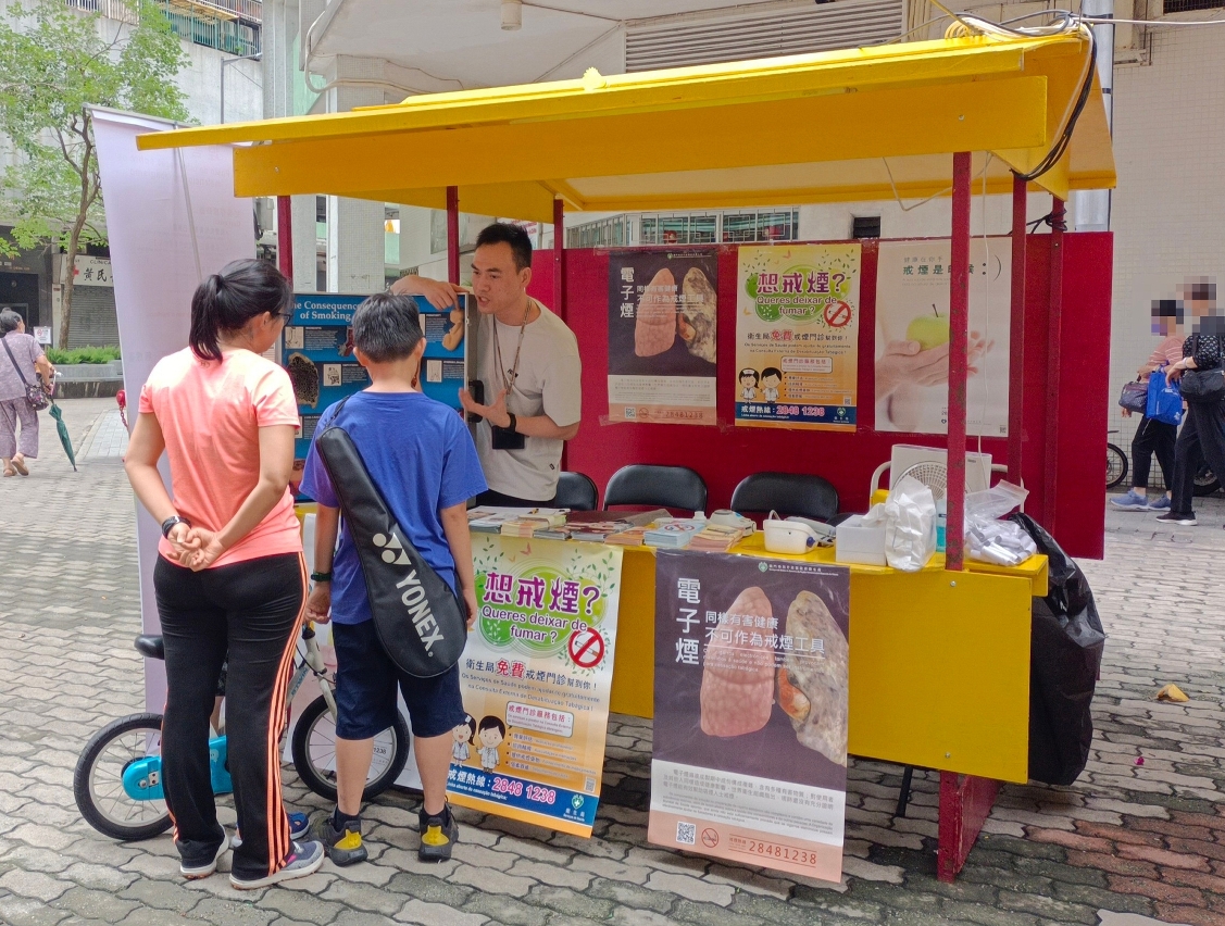 此外,为响应“世界无烟日”,卫生局举办“烟害咨询站”活动,于5月的每个周六下午轮流于本澳多个地方设置站点,向居民解答有关烟害的查询、为有兴趣戒烟人士提供一氧化碳含量、尼古丁依赖程度的测试及血压测量服务,并宣传卫生局的戒烟门诊服务;现场亦摆放烟害展板及模型教具及提供“下一代 无烟害”为主题的拍照相框道具供居民拍照留念。是次的“烟害咨询站”活动获得巿政署协助借出包括白鸽巢公园、氹仔花城公园侧、黑沙环公园和绿杨花园休憩区等场地。