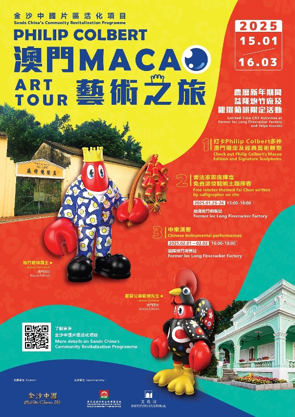 金沙中国于1月15日至3月16日期间在益隆炮竹厂旧址及龙环葡韵带来 “Philip Colbert澳门艺术之旅”,展出合共七件主题艺术雕塑,当中两件是当代普普艺术家Philip Colbert特意为切合两园区主题及特色而全新打造的澳门限定巨型雕塑作品《炮竹龙虾国王》及《葡国公鸡龙虾先生》。活动期间,园区内将增设富艺术家标志性龙虾元素的特色布置及限时节庆活动,欢迎市民及旅客漫步氹仔旧城区,找寻“龙虾国王”的足迹。