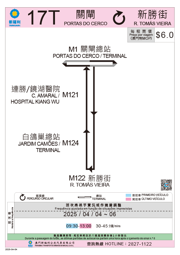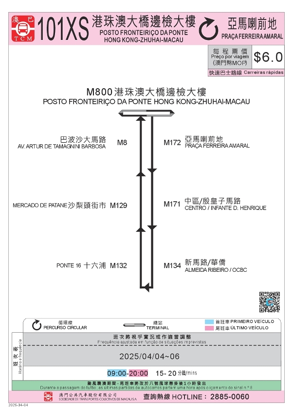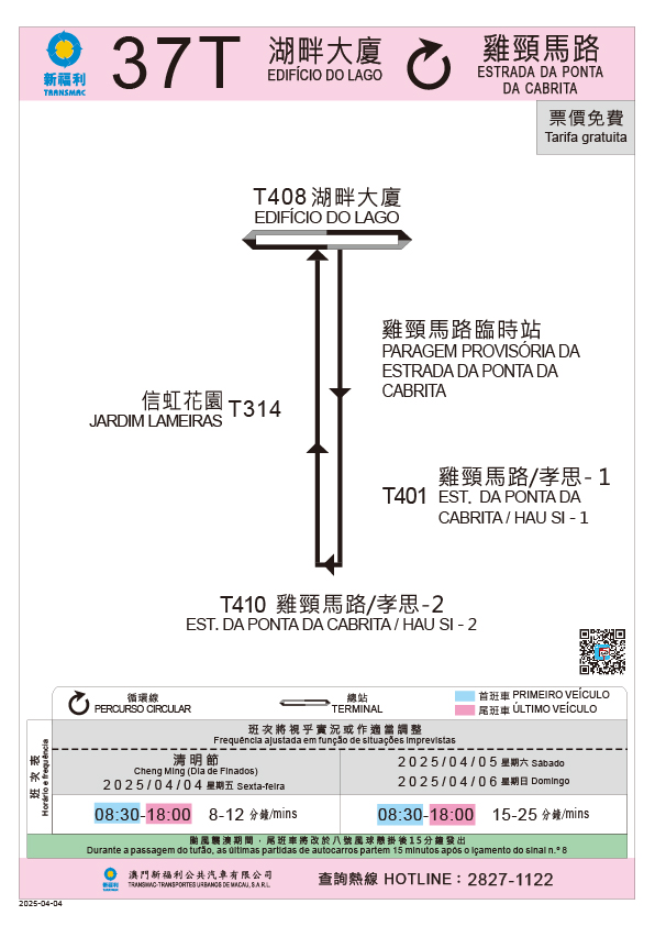 - 4月4日至4月6日每日首班车至尾班车,MT4路线(前往氹仔客运码头方向)临时不停靠“栢港停车场”站,改靠巴素打尔古街近非利喇街的临时巴士站;