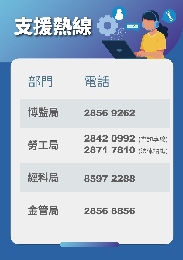 此外,相关部门亦已推出支援热线,包括博彩监察协调局(28569262)、经济及科技发展局(85972288)、金融管理局(28568856),方便有需要的居民进行查询。