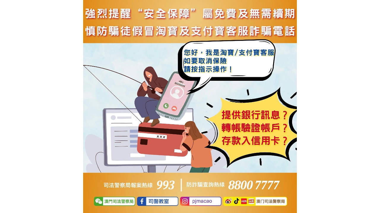 今年本澳出现假冒“淘宝”或“支付宝”客服的电话诈骗案件后,司警局于上半年已先后三次采取行动,成功捣破相关犯罪窝点。然而,该类诈骗手法近期再度出现,局方于8月中发出警情通告,提醒市民提高警惕。