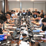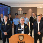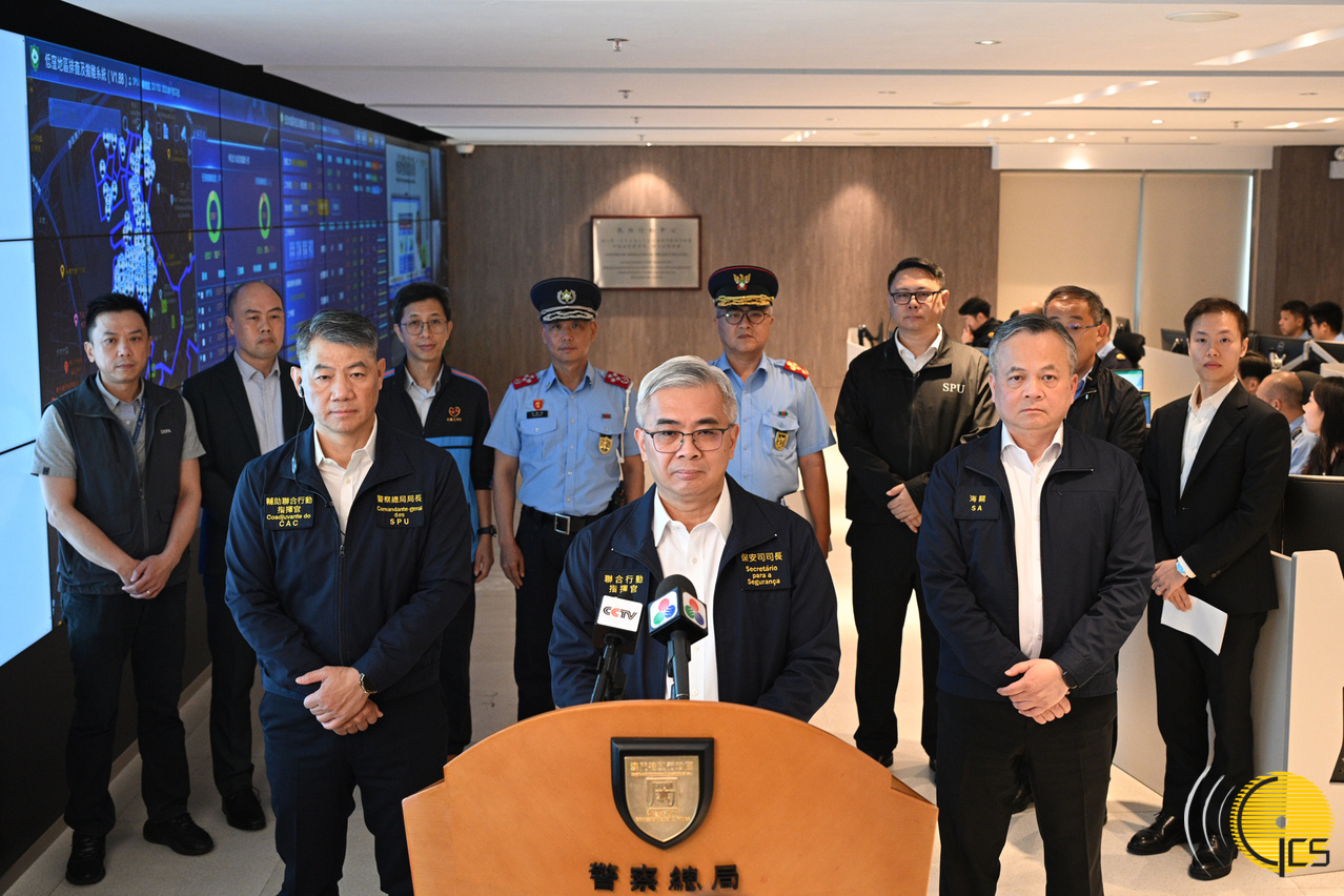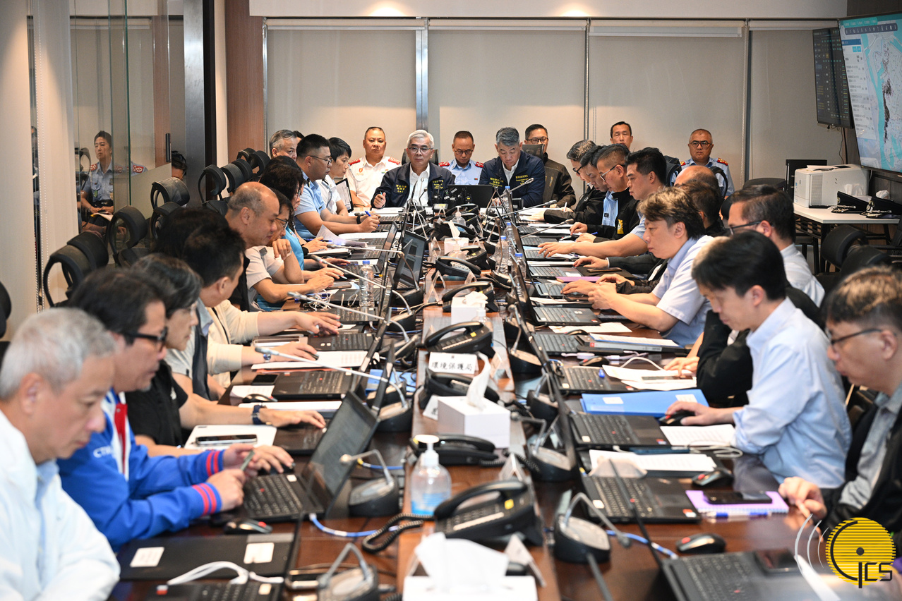 保安司司长、联合行动指挥官黄少泽在民防行动中心听取民防架构成员应对超强台风“桦加沙”的工作汇报,并作出指示。
