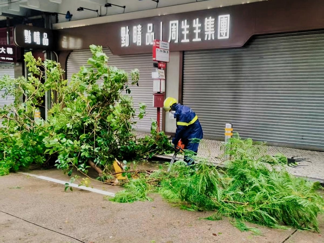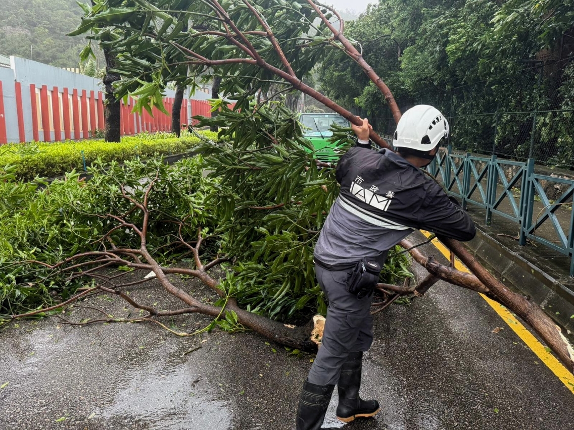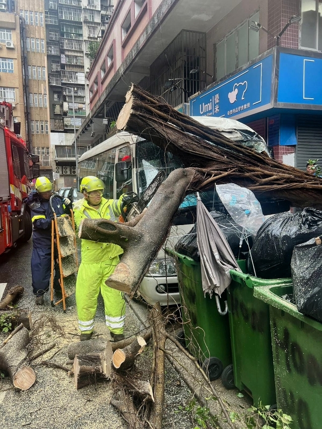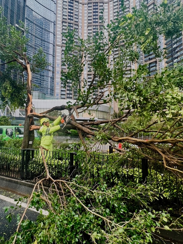 在民防中心统筹下,市政署接获树木受损及倒塌报告,并派员在安全情况下优先清理阻碍交通干道之塌树断枝,以尽快开通道路。