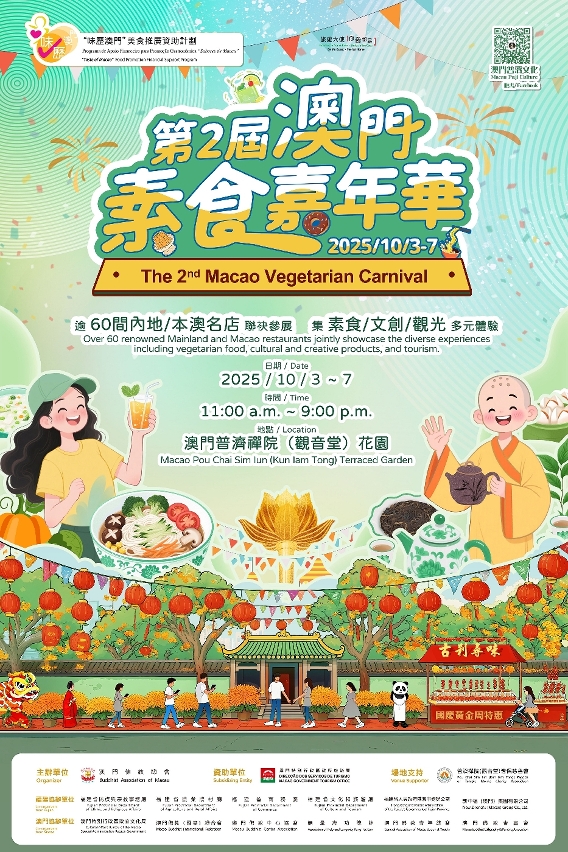 “第二届澳门素食嘉年华”于10月3至7日在普济禅院(观音堂)花园区举行,以“古剎寻味”为主题,设有超过60个素食及文创展位,同场并有非遗表演、书画订制和亲子游戏等活动,推广素食文化。