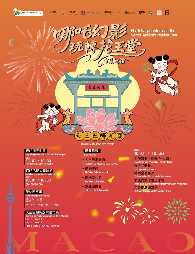 主办单位于10月1至30日的每个晚上,在大三巴哪咤庙外墙上演主题光影秀,并在位于茨林围的“哪咤文化馆”推出“哪咤诞”光影体验。此外,将分别于10月4、5、11及12日在茨林围,以及于10月18、19、24及25日在大三巴哪咤庙前举办市集,集结本地手作、传统美食及哪咤主题文创产品,让公众沉浸式体验国家级非物质文化遗产 - 澳门哪咤信俗的独特魅力。