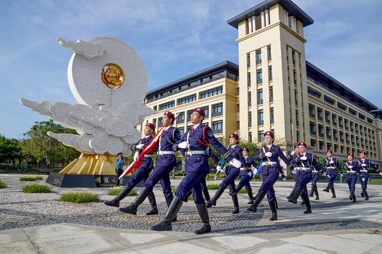 澳大国旗仪仗队队长何晓盈表示,今年是中华人民共和国76周年华诞,同时亦是纪念中国人民抗日战争暨世界反法西斯战争胜利80周年。回望80多年前,神州大地饱经苦难与屈辱;再看今日中国,处处涌动着蓬勃生机与希望。这背后,是无数革命先辈以热血染红旗帜,以生命铺就道路,才换来的繁荣昌盛。作为澳大的优秀青年团体,澳大国旗仪仗队势必担当起榜样的责任,弘扬爱国爱澳文化,守护好国旗的尊严,传播好国旗的故事,以青春热血献上对这片土地最深沉的爱,展示新时代澳门青年的力量与担当。