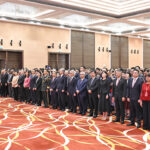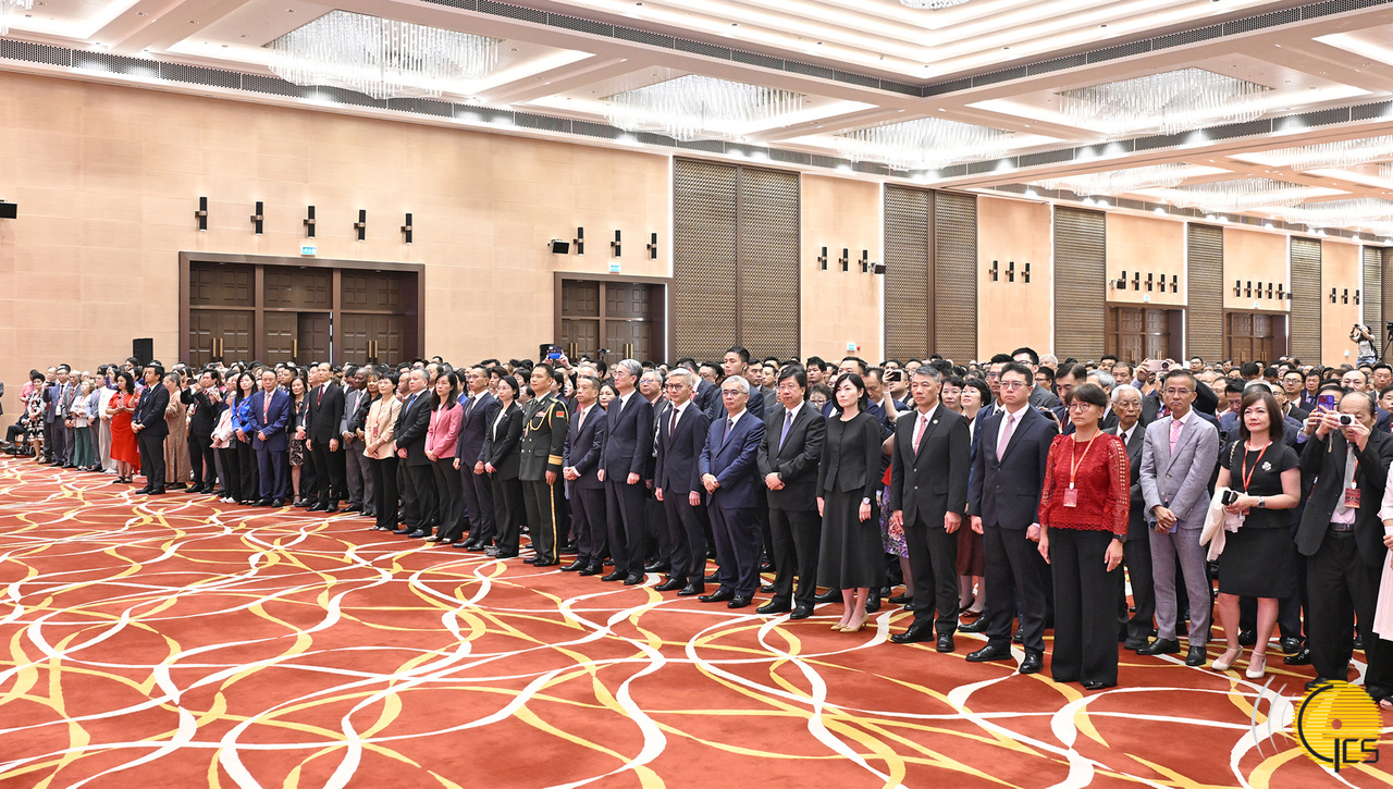 行政长官岑浩辉等主礼嘉宾在澳门特别行政区政府庆祝中华人民共和国成立76周年招待酒会上祝酒。