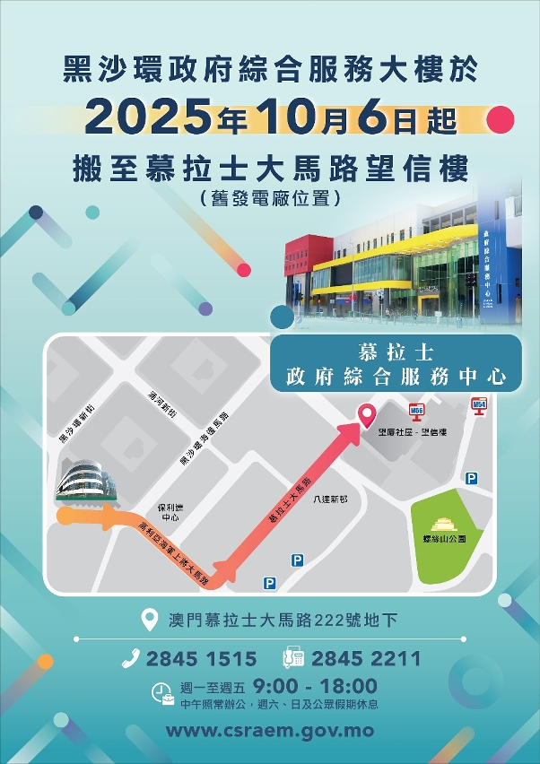 请市民留意,即日起,位于慕拉士的“政府综合服务中心”(澳门慕拉士大马路222 号地下)正式启用,而位于黑沙环的政府综合服务大楼同日停止运作。居民如需前往市政署辖下市民服务中心及分站,或社保基金各服务点缴款,可提前透过“一户通”或“商社通”的相关预约取筹功能预约,以节省轮候时间。如欲了解更多资讯,可浏览社保基金网站www.fss.gov.mo或于办公时间致电28532850查询。