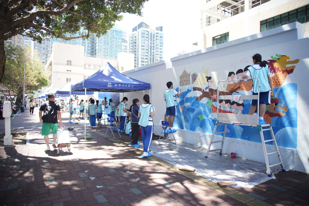 政府船坞墙身绘画作品日前已完成创作,本澳10间学校师生围绕“守护海上安全”、“澳门海洋文化”、“海与生活”及“我们的海洋”主题创作了合共11幅作品,为单调的厂房外墙增添艺术色彩。线上票选活动将由10月7日开始,欢迎市民透过海事及水务局微信公众号进入“2025扬帆启航海事节”线上游戏的票选专区,投选心仪作品。