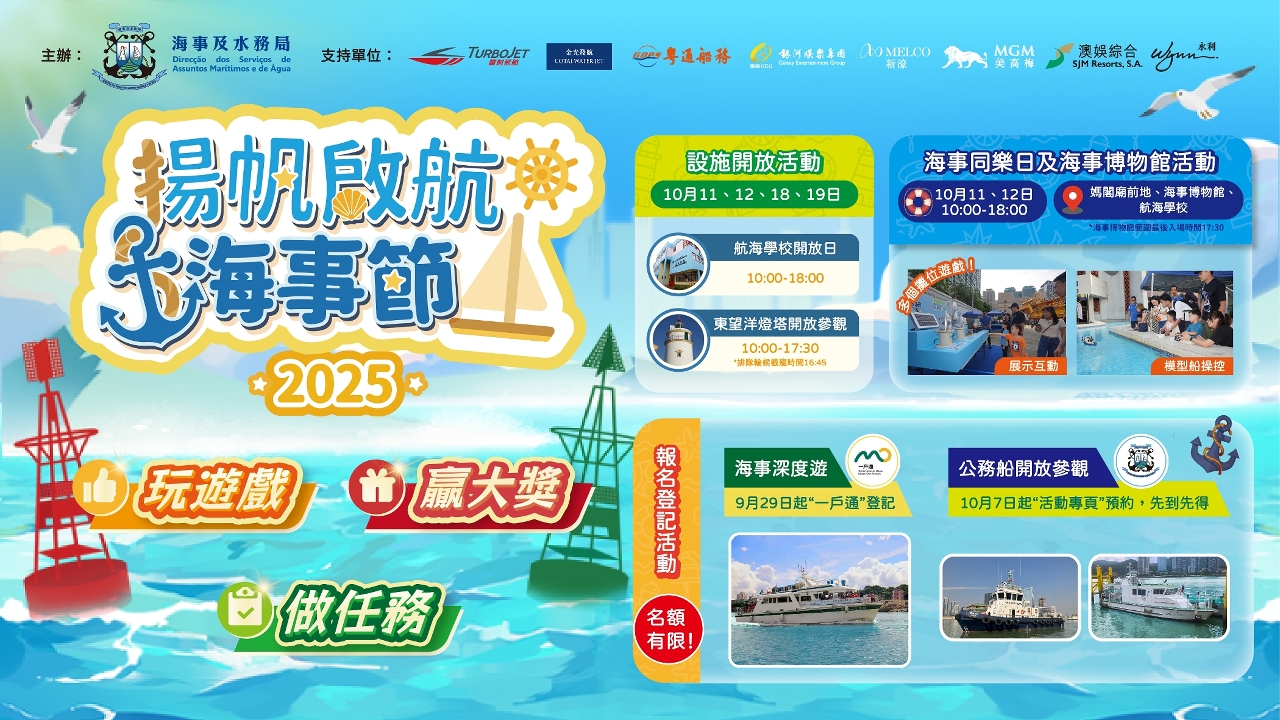 “2025扬帆启航海事节”重头戏“海事同乐日”将于本周六、日在妈阁庙前地举行,届时航海学校、海事博物馆和东望洋灯塔亦同步举行开放活动。部份活动需提前预约,详情可浏览海事及水务局网页www.marine.gov.mo内的活动专页。