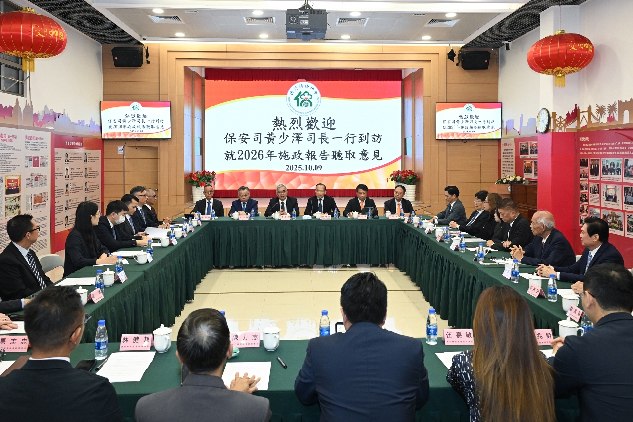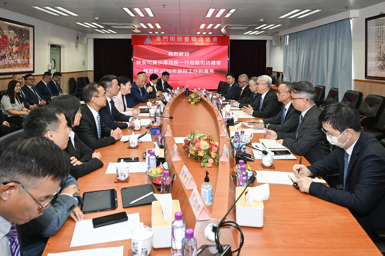 保安司司长黄少泽近日率领辖下多个部门的领导,先后拜访澳门妇女联合总会、澳门福建同乡总会及民众建澳联盟、澳门归侨总会、澳门工会联合总会、澳门中华总商会、澳门街坊会联合总会,举行座谈,听取和收集各社团对保安范畴2026年施政工作的意见和建议。各社团代表主要围绕维护国家安全、防灾减灾应急管理、前瞻执法、智慧警务和社区警务等议题提出意见与建议。