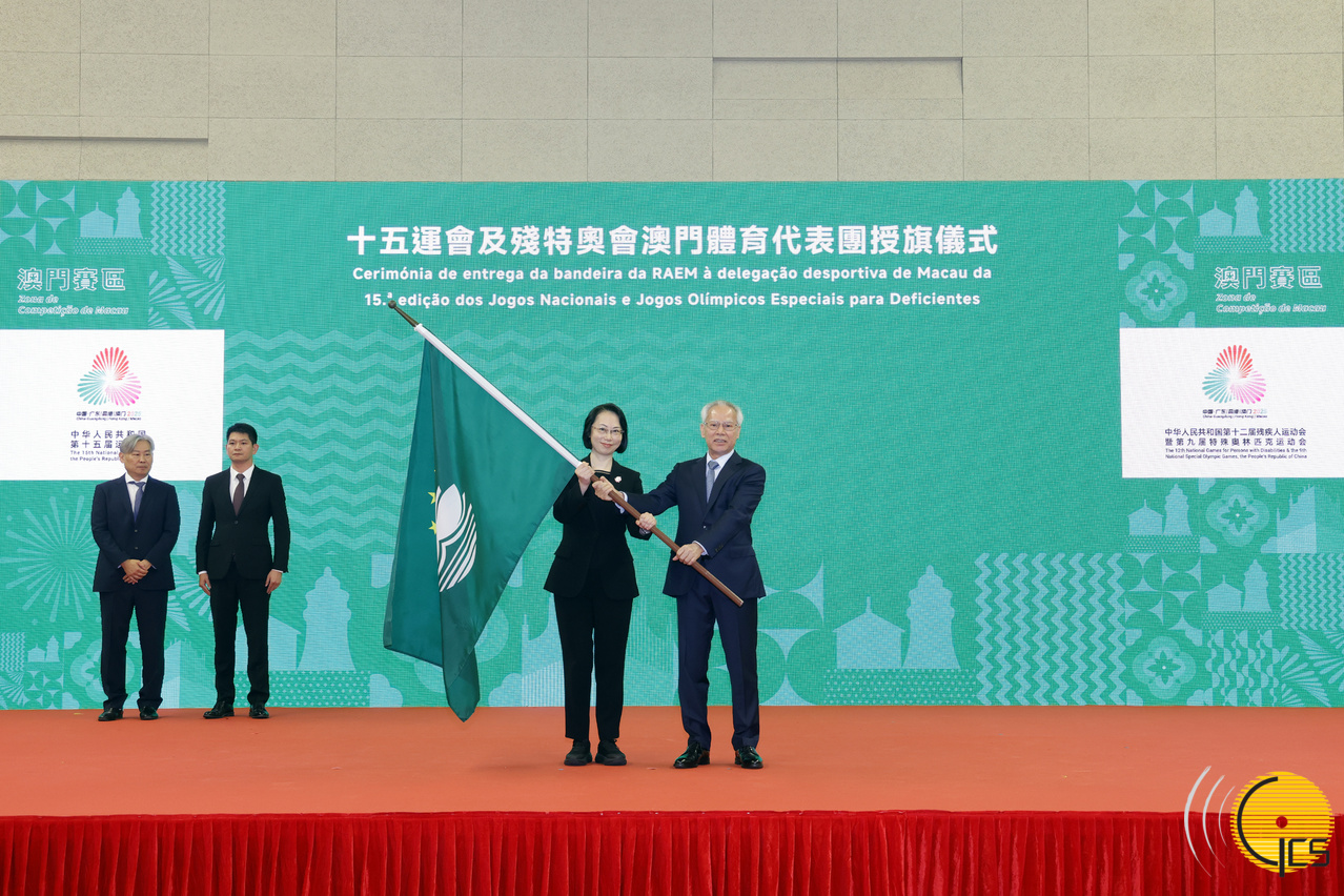 仪式在庄严的国歌声和会歌《气势如虹》激昂旋律中拉开序幕。行政长官岑浩辉向十五运会及残特奥会澳门体育代表团代表、社会文化司司长柯岚授予特区区旗及勉励体育代表团取得佳绩。本澳将分别派出超过400人的体育代表团参加十五运会的23个比赛项目,包括:水上运动(游泳、艺术游泳、跳水)、田径、羽毛球、篮球(三人篮球、五人篮球)、拳击、单车、独木舟(静水)、剑击、足球、高尔夫球、手球、柔道、射击、乒乓球、跆拳道、网球、铁人三项、排球(室内排球、沙滩排球)、武术、射箭、曲棍球、赛艇、帆船;亦将派出超过180人的体育代表团分别参加全国第十二届残疾人运动会的7个比赛项目,包括:田径、羽毛球、硬地滚球、轮椅剑击、铁人三项、游泳、乒乓球;以及参加第九届特殊奥林匹克运动会的7个比赛项目,包括:田径、羽毛球、篮球、滚球、足球、游泳、乒乓球。