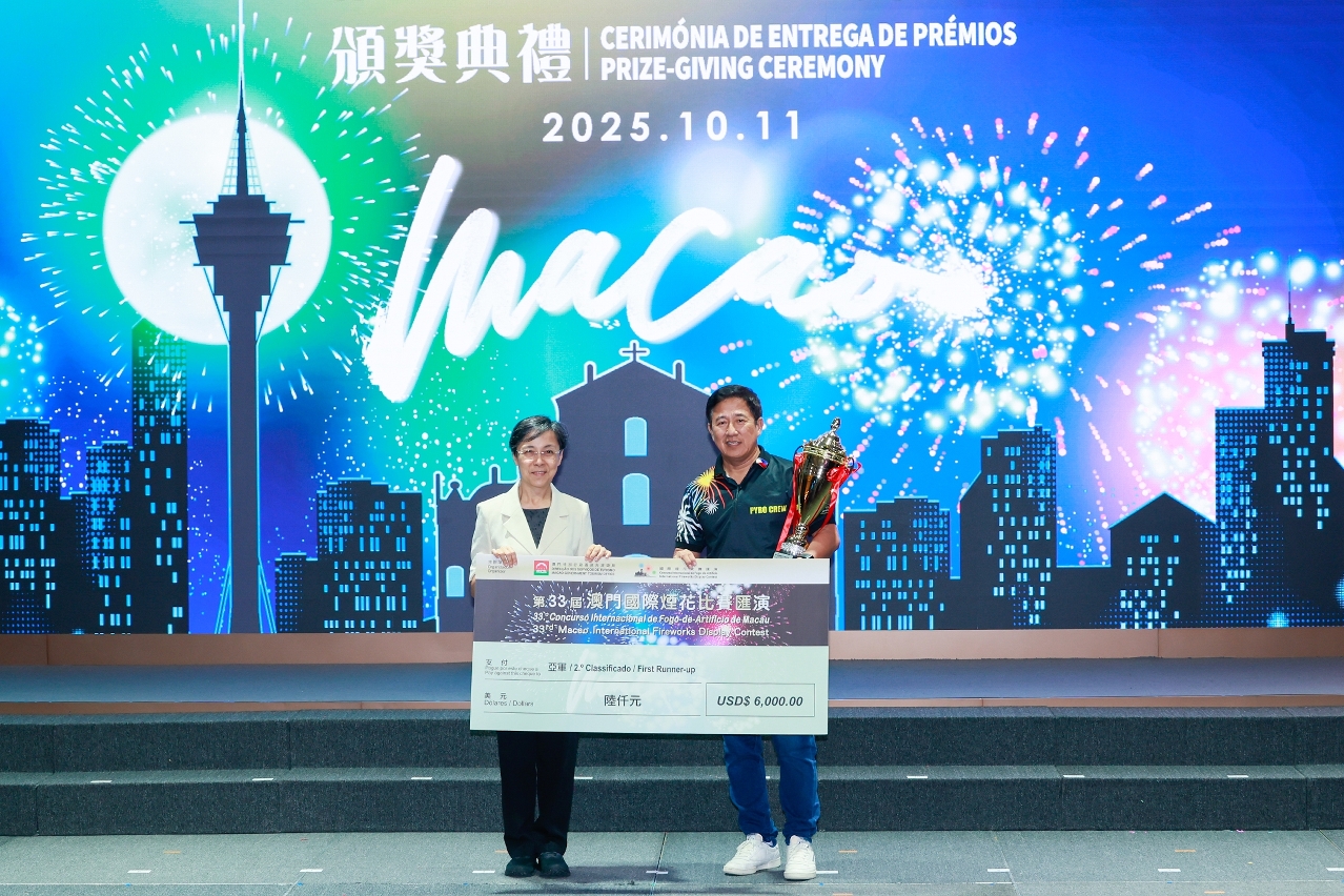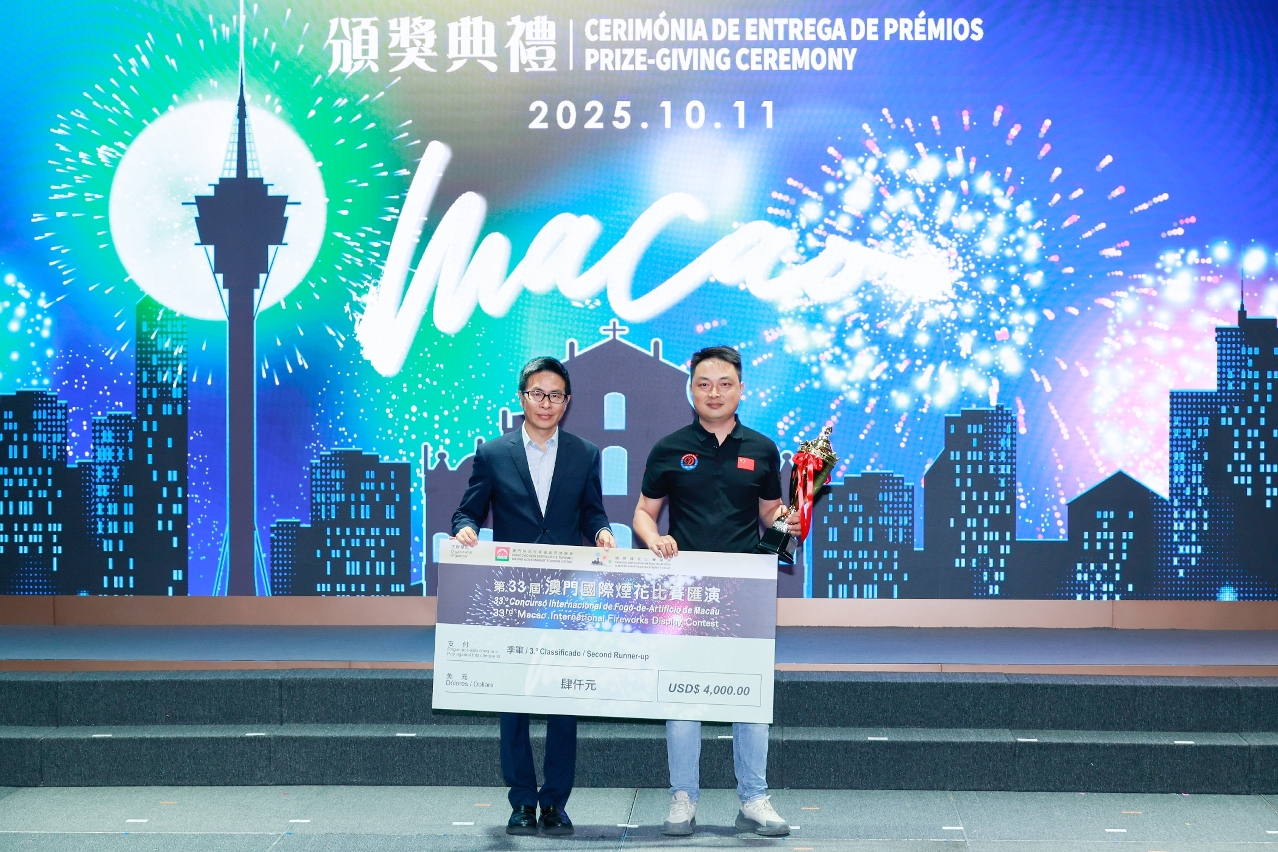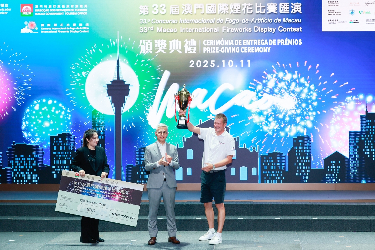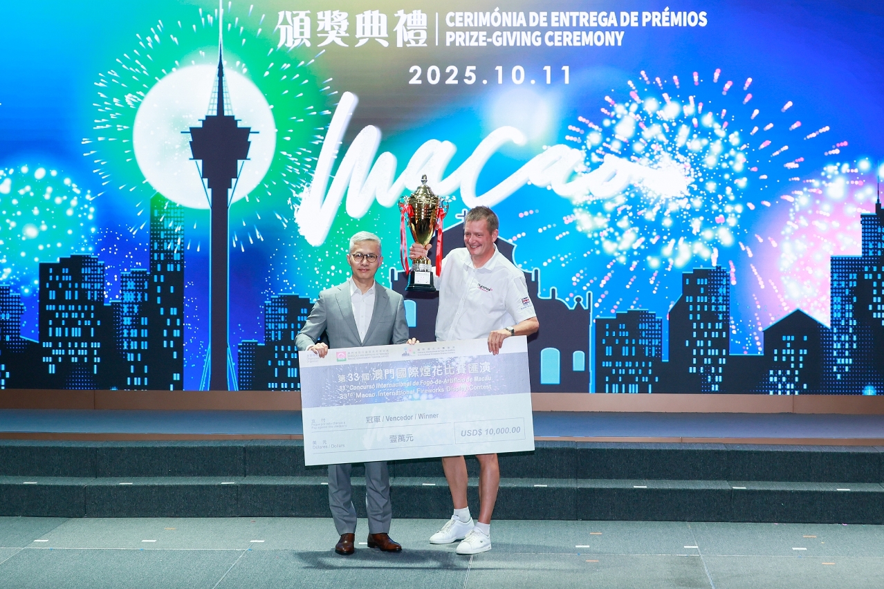 旅游局主办的第33届澳门国际烟花比赛汇演于今(11日)晚上圆满落幕并举行颁奖典礼。来自世界各地的10间烟花公司施展浑身解数,在横跨9月和10月的5个烟花夜争妍绽放。经过一轮角逐,最终由来自英国的PyrotexFireworx烟花公司夺得冠军宝座,来自菲律宾的Platinum Fireworks烟花公司及中国的东信烟花公司分别夺得亚军及季军。