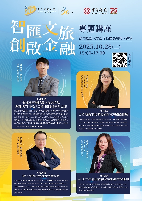 在喜迎澳门旅游大学建校30周年及澳门中银成立75周年之际,为推动智慧旅游与金融科技领域的学术融合与产业实践,澳门旅游大学与澳门中银将于2025年10月28日(星期二)下午 3 时至 5 时,在澳门旅游大学氹仔校区展望楼大礼堂,联合举办“智汇文旅,创启金融”专题讲座。