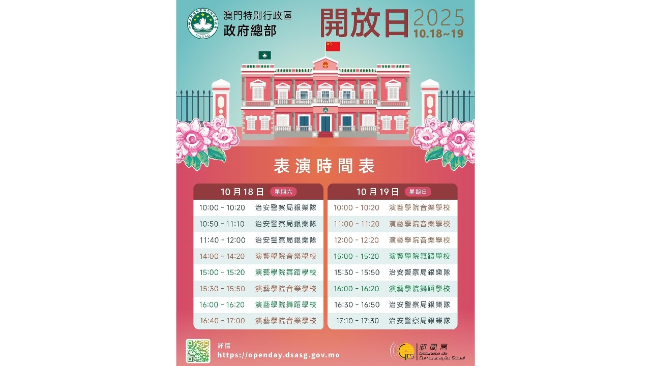 表演节目方面,治安警察局银乐队、演艺学院音乐学校和舞蹈学校学生将于两天开放日的指定时段,为公众呈献乐器演奏及舞蹈表演。邮电局继续在政府总部对面的南湾湖畔设置临时柜枱,提供加盖纪念邮戳的服务,并发售相关邮品。