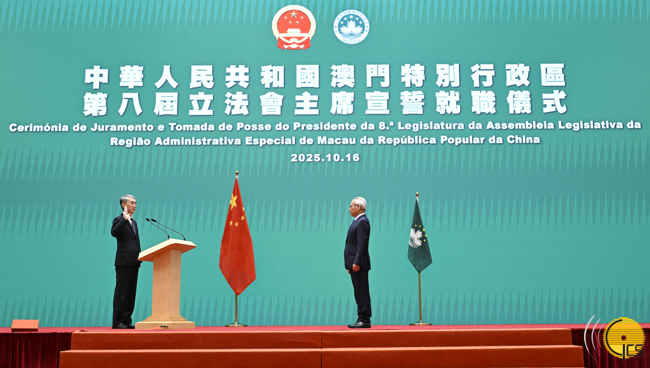 行政长官岑浩辉为宣誓就职的澳门特别行政区第八届立法会主席张永春监誓。