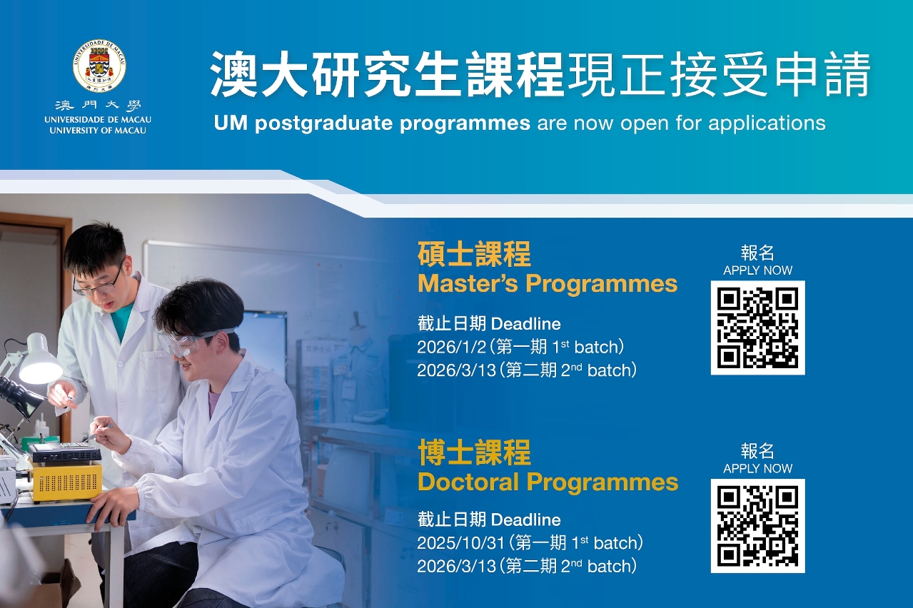 澳大表示,为配合澳门经济适度多元发展所需,精准对接产业需求,2026/2027学年新增多个研究生课程,涵盖智能电网、人工智能与教育、药物科学等领域。此外,澳大致力为社会培养高素质及全方位发展的人才,为研究生设立了多项奖学金及资助,包括澳大博士生奖学金、澳大博士生教研助理、澳大理工科课程奖学金等。