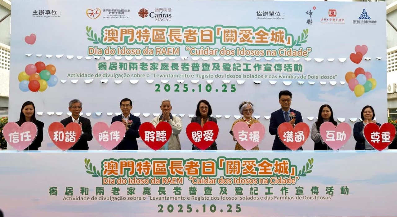由社会工作局与澳门明爱合办,澳门街坊会联合总会、澳门工会联合总会和澳门妇女联合总会协办的2025澳门特区长者日“关爱全城”―独居和两老家庭长者普查及登记工作宣传活动,于10月25日下午在石排湾业兴三街广场顺利举行,活动内容包括“独居和两老家庭长者普查及登记工作”的启动仪式、摊位游戏和话剧表演等,共吸引约2,000人次参与。