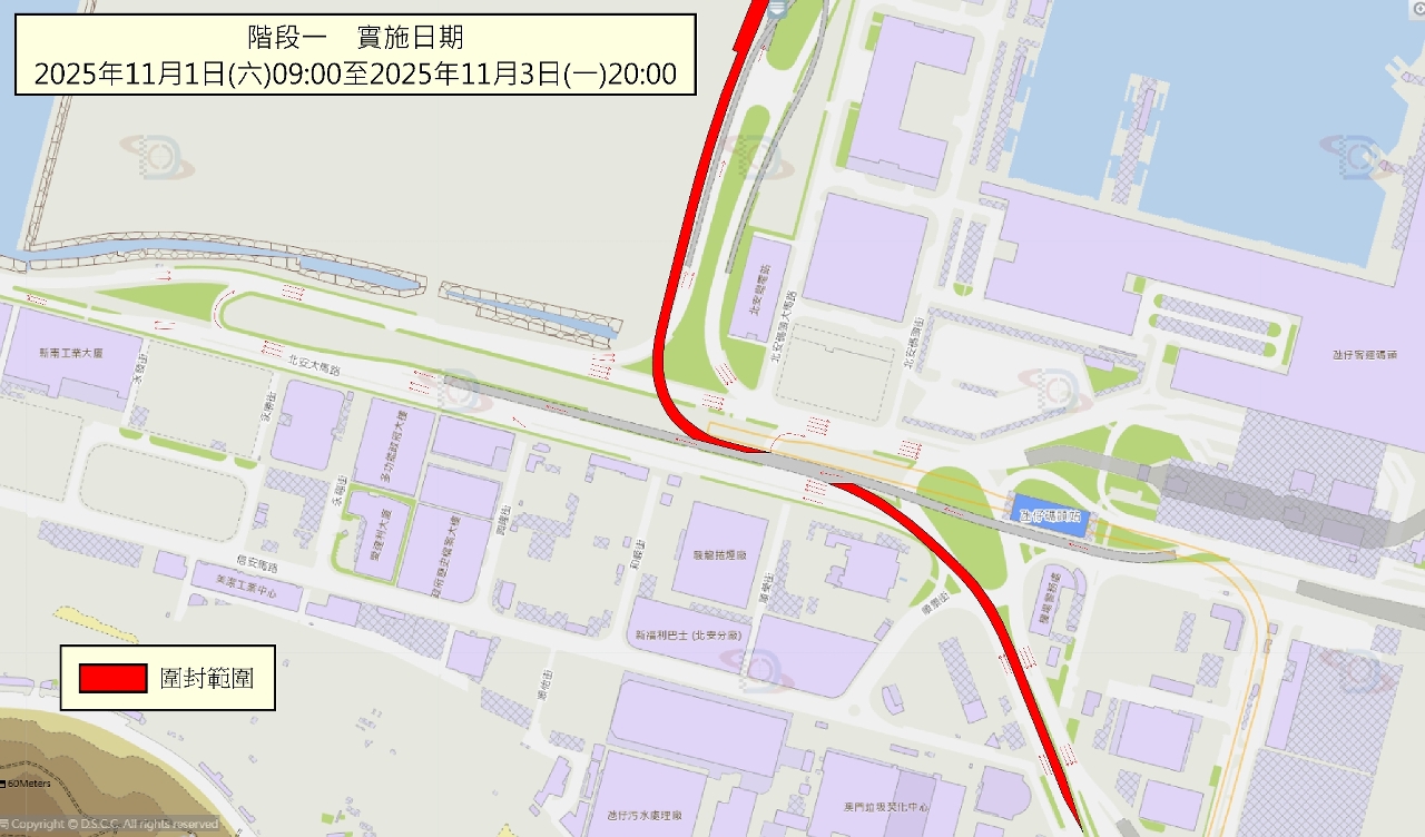 阶段一:11月1日早上9时至3日晚上8时,届时氹仔伟龙马路往澳门大桥方向的一段引桥将临时封闭(详见图一),驾驶者可前往北安大马路的调头处,再前往澳门大桥。