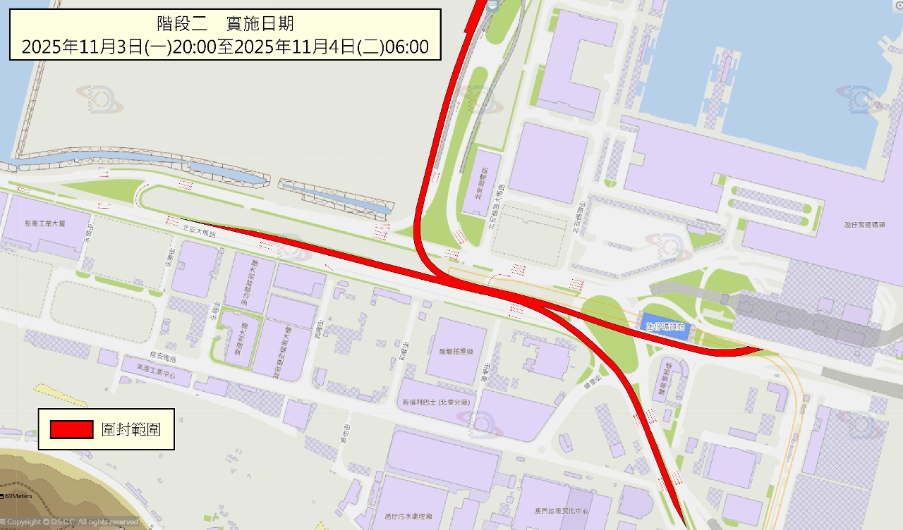 阶段二:11月3日晚上8时至4日清晨6时,届时氹仔伟龙马路及氹仔码头往北安大马路方向及澳门大桥的引桥将临时封闭(详见图二);车辆须经北安大马路掉头前往澳门大桥。