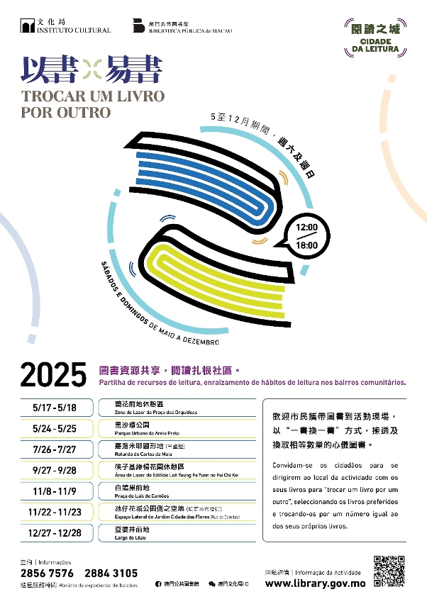 文化局诚邀市民踊跃参与“以书易书”活动,让闲置好书得以流通再生,携手推广阅读文化。活动详情可于文化局公共图书馆柜台服务时间致电2856 7576或2884 3105查询、或浏览澳门公共图书馆网站(www.library.gov.mo)及“我家图书馆”手机应用程式。