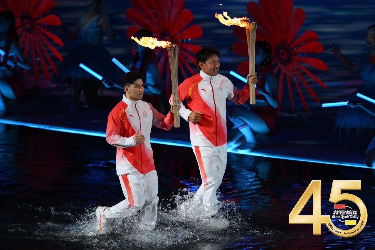 十五运会澳门首面金牌得主(空手道男子团体型金牌)、澳门理工大学体育教育学士课程学生方文浩,于开幕仪式上担任火炬手,先在场内进行火炬传递,再由澳门首位亚运会女子金牌得主(女子长拳金牌)、澳门理工大学运动及体育硕士学位课程毕业生李祎,与男子 100米亚洲纪录保持者苏炳添和奥运会男子花剑金牌得主香港运动员张家朗,粤港澳三地运动员代表共同点燃主火炬。