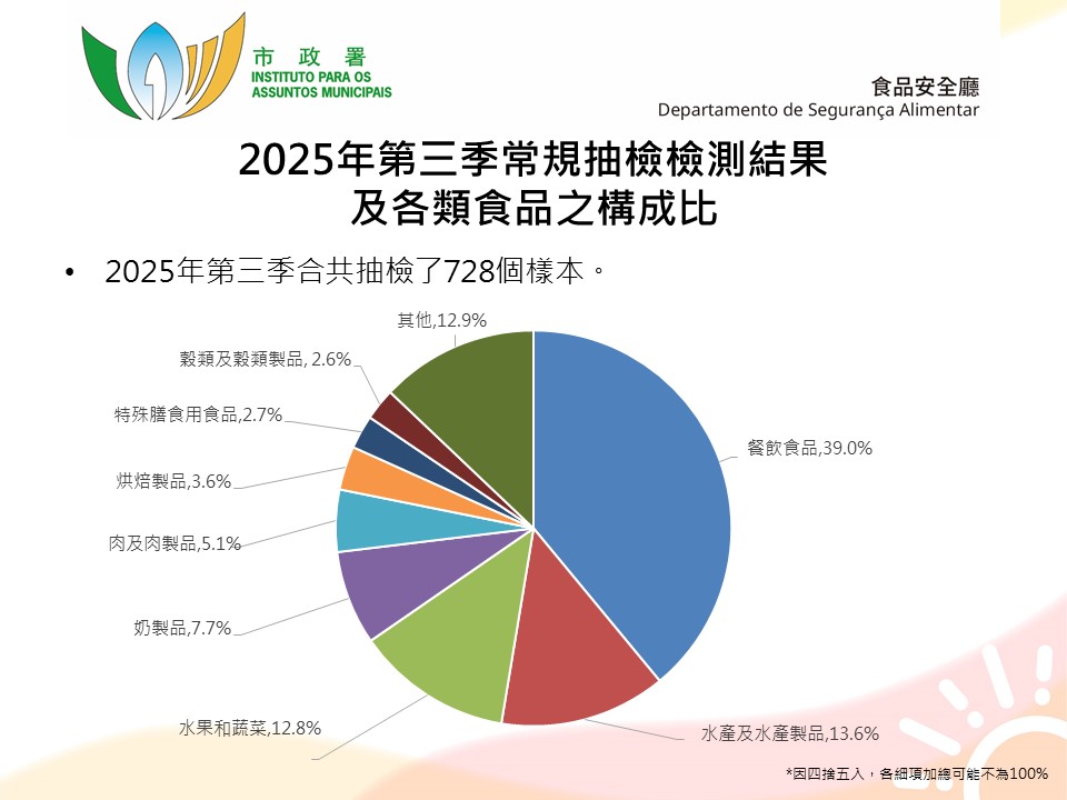 第三季合共抽检七百二十八个食品样本,包括二百八十四个一般市售食品样本和四百四十四个餐饮食品样本,抽检点涵盖本澳各区食肆、外卖店、熟食中心、超级市场、零售鲜活食品场所及杂货店等。微生物检测项目包括沙门氏菌属、单核细胞增生李斯特氏菌、蜡样芽孢杆菌等常见微生物参数,化学检测项目包括重金属、食品添加剂及禁用物质等。