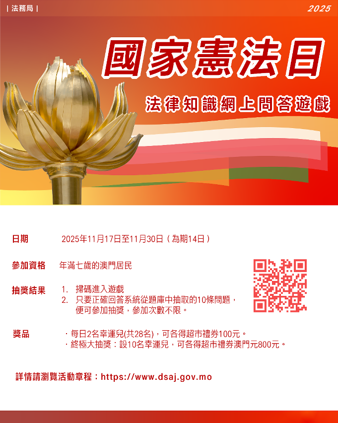 今年是第十二个“国家宪法日”,法务局于2025年11月17日至11月30日(为期14日)期间举办“国家宪法日”法律知识网上问答游戏,透过寓学习于娱乐的游戏方式,加强社会各界对《宪法》和《澳门基本法》的认识,欢迎本澳居民参加。