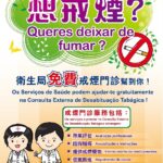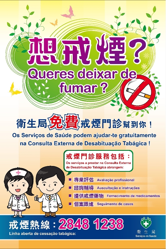 卫生局再次呼吁吸烟人士为了自身和家人健康应立即戒烟,有意戒烟者可透过卫生中心/仁伯爵综合医院转介,亦可透过“一户通”内“我的健康→卫生教育→戒烟评估门诊”进行预约,或于办公时间内致电2848 1238预约戒烟门诊,详细情况亦可查阅”澳门控烟资讯网” ( https://www.ssm.gov.mo/apps1/smokefree/ch.aspx#clg3504 )或以电邮 (gpcta@ssm.gov.mo)、电话(28556789)联络卫生局防控烟酒办公室。