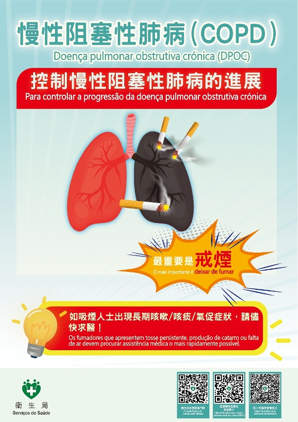 吸烟是慢性阻塞性肺病的主要成因,为贯彻落实《健康澳门蓝图》中降低烟草使用率的目标,特区政府透过“关口前移”、“资源下沉”,广泛联动各界社团机构力量,以立法、执法、教育宣传及鼓励戒烟等多管齐下策略,执行各项控烟政策和措施,与各界共同努力,携手共建健康社区。