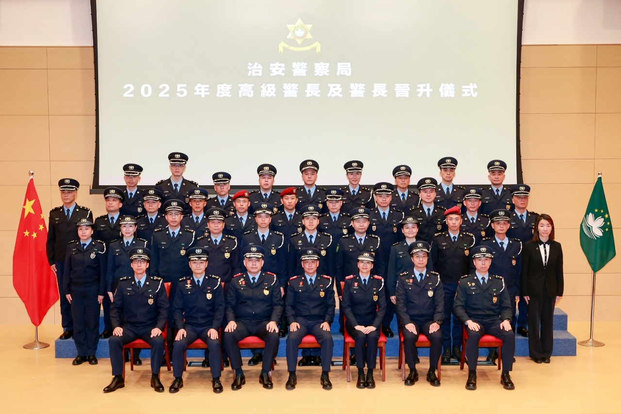 吴锦华局长在仪式中向晋升人员表示祝贺,勉励他们要严明纪律,恪守规矩,以全局思维执行工作,同时须铭记保安司司长的郑重叮嘱,务必深刻领会“慎独、慎微、慎初”的真义并内化于心,筑牢“不敢腐、不能腐、不想腐”的思想与制度防线,共同铸就一支“廉洁高效、专业精干”的警察队伍;并寄语他们要牢记初心使命,以忠诚践行职责,以担当回应期盼,以法治守护安宁,以服务温暖民心,在维护国家安全、守护澳门社会稳定、保障市民生命财产安全的道路上,作出更大的贡献。