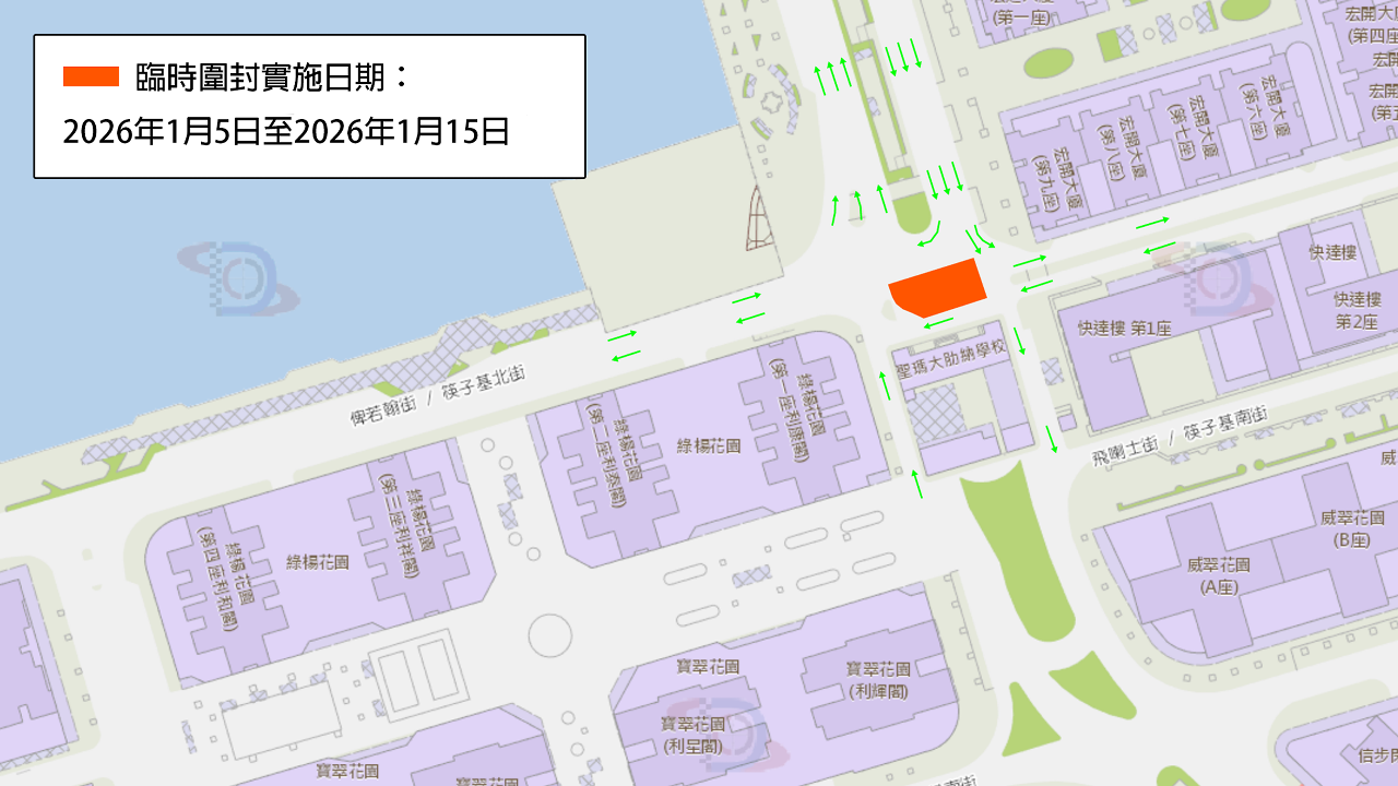 配合施工需要,圣玛大肋纳学校附近的俾若翰街路面将于2025年12月3日至2026年1月15日分阶段实施有限度通车(具体安排见附图)。公共建设局和交通事务局将定期检视有关路段的交通状况,适时公布后续阶段的具体临时交通和巴士安排,亦会严格监督工程质量及进度,着力做好协调工作,减少工程对交通和道路用户的影响。