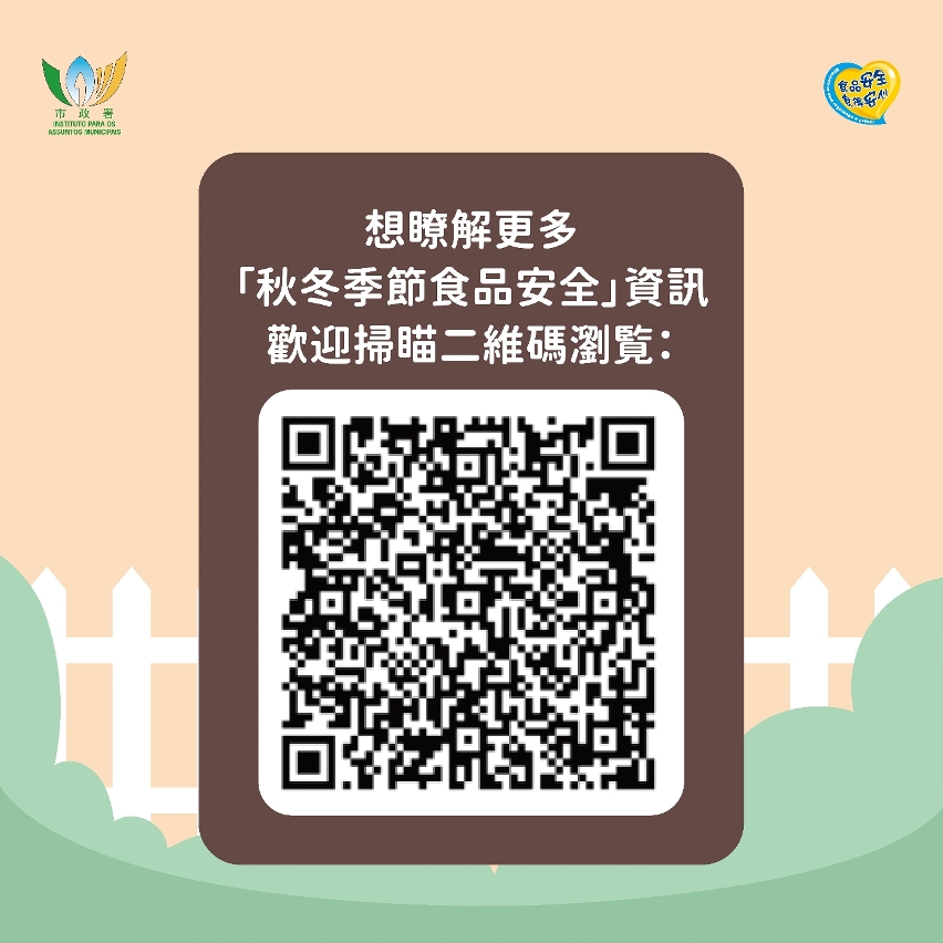 市政署持续透过举办不同形式的社区推广活动,提高市民对食品安全的关注。更多秋冬季食安提示资讯,可浏览食品安全资讯网https://www.iam.gov.mo/foodsafety“秋冬季节食品安全"专页。