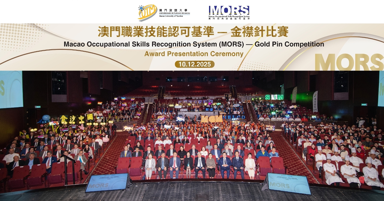 澳门旅游大学于 2025 年 12 月 10 日举行“澳门职业技能认可基准(MORS)”金襟针比赛颁奖典礼。出席嘉宾包括澳门旅游大学校董会主席陈泽武、澳门旅游大学校长黄竹君、澳门特区政府旅游局局长文绮华、劳工事务局局长陈元童、金沙中国有限公司行政副主席王英伟、澳门酒店旅业职工会会长李宝来及澳门酒店协会理事长钟友雄。