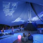 由澳门本地艺术家陆曦主理的《十二星座图谱》灯光装置,将南湾白帐篷穹顶变成一片投影画布,通过互动装置选择心愿祝福语,化作一道道星光升起跃上天幕,与无数星辰一同闪烁。
