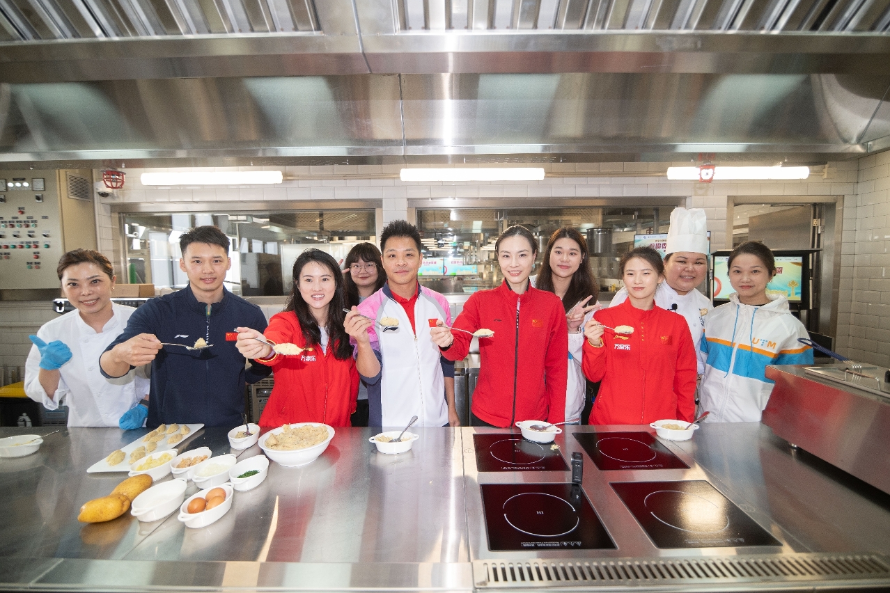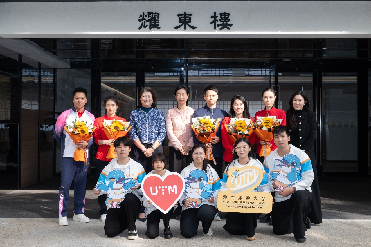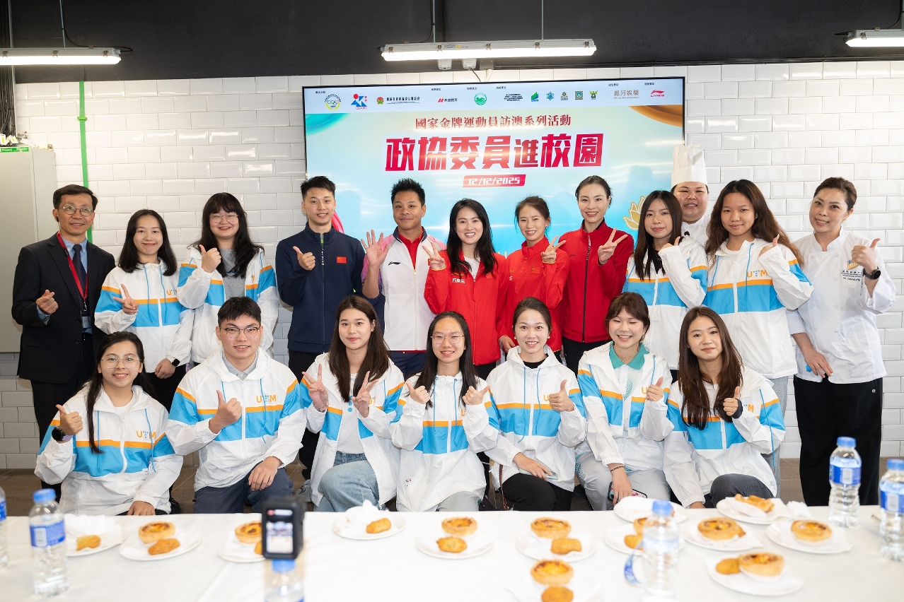 其后,多位国家金牌运动员,包括陈若琳、陈芋汐、吴敏霞、何冲及陈艾森亲临校园,与学生近距离互动。运动员们畅谈训练点滴与赛场故事,学生亦踊跃提问,现场气氛热烈。活动尾声,一众嘉宾在师生陪同下参观了澳门旅游大学氹仔校区耀东楼的教学设施,了解大学在旅游教育方面的创新实践。运动员更与学生们共同参与富有文化特色的体验环节,一起动手制作澳门土生葡菜——马介休球,并品尝新鲜出炉的葡挞。