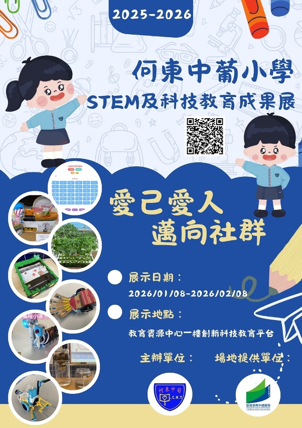 何东中葡小学STEM及科技教育成果展于2026年1月8日至2月8日在教育及青年发展局辖下教育资源中心创新科技教育平台进行,以“学以致用‧启发创意”为主题,展现何东中葡小学在STEM与科技教育的多元实践。