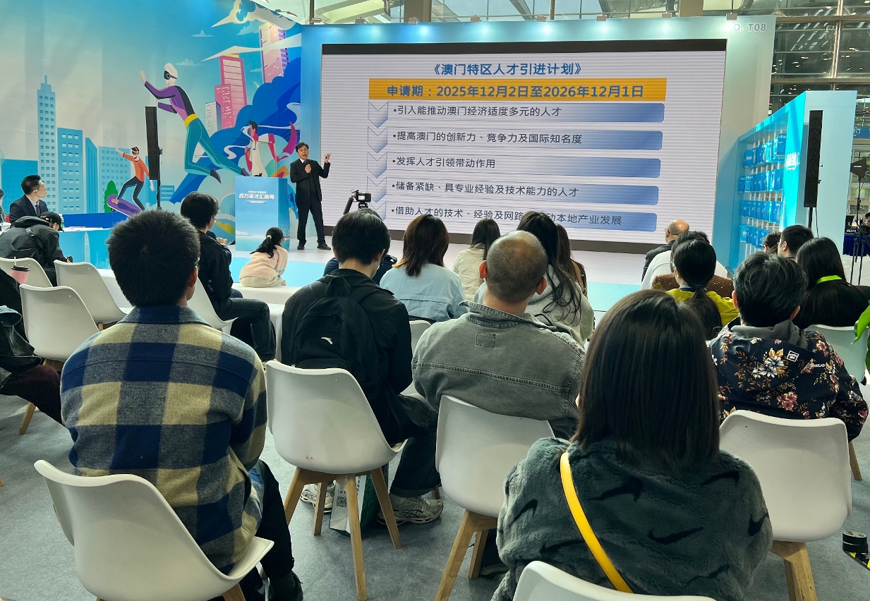 应广东省人力资源和社会保障厅的邀请,人才委于“百万英才汇南粤”秋季大型综合招聘会中设置展位,展示澳门的社会及经济发展现况、澳门具备的优势及机遇等,并重点介绍自2025年12月2日起开展的第三期人才引进计划,包括与重点产业相关人才计划的申请详情。