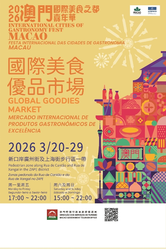 “2026澳门国际美食之都嘉年华”于3月20至29日举行,主会场选址新口岸区的澳门渔人码头罗马广场及励骏大道,首次设置的分会场则位于广州街及上海街一带。来自全球近40个联合国教科文组织“创意城市美食之都”的代表联同10个来自海内外其他范畴创意城市的代表、专家学者、澳门旅游业及餐饮业界,合力擦亮“国际美食大道”、“美食之都厨艺展示”、“澳门国际美食论坛”以及全新登场的“环球美酒廊”和“国际美食优品市场”,打造全方位的美食与交流体验。