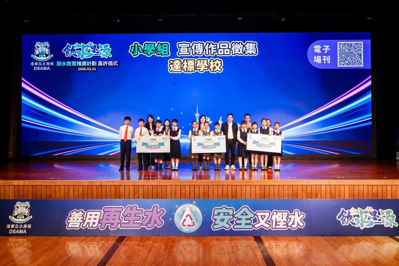 是次计划分为中学组(电绘、手绘)及小学组(海报、口号设计、四格漫画及短片),各校师生围绕“善用再生水,安全又悭水”主题创作了454份结合再生水和节水的绘本及宣传作品,共同说好澳门节水故事,同时表达对祖国长期保障澳门供水安全的感恩之情。经评审共138份作品获奖,海事及水务局在嘉许仪式上向获奖师生颁发嘉许状。中学组一等奖的学生同时参与了由国家水利部珠江水利委员会举办的“节水珠江 你我同行”宣传活动,获得该委员会颁发嘉许证明。获奖名单及作品已上载至海事及水务局网页www.marine.gov.mo,作品将于明日(22日)在珠海“2026年‘世界水日 中国水周’珠海系列宣传活动”中展出。