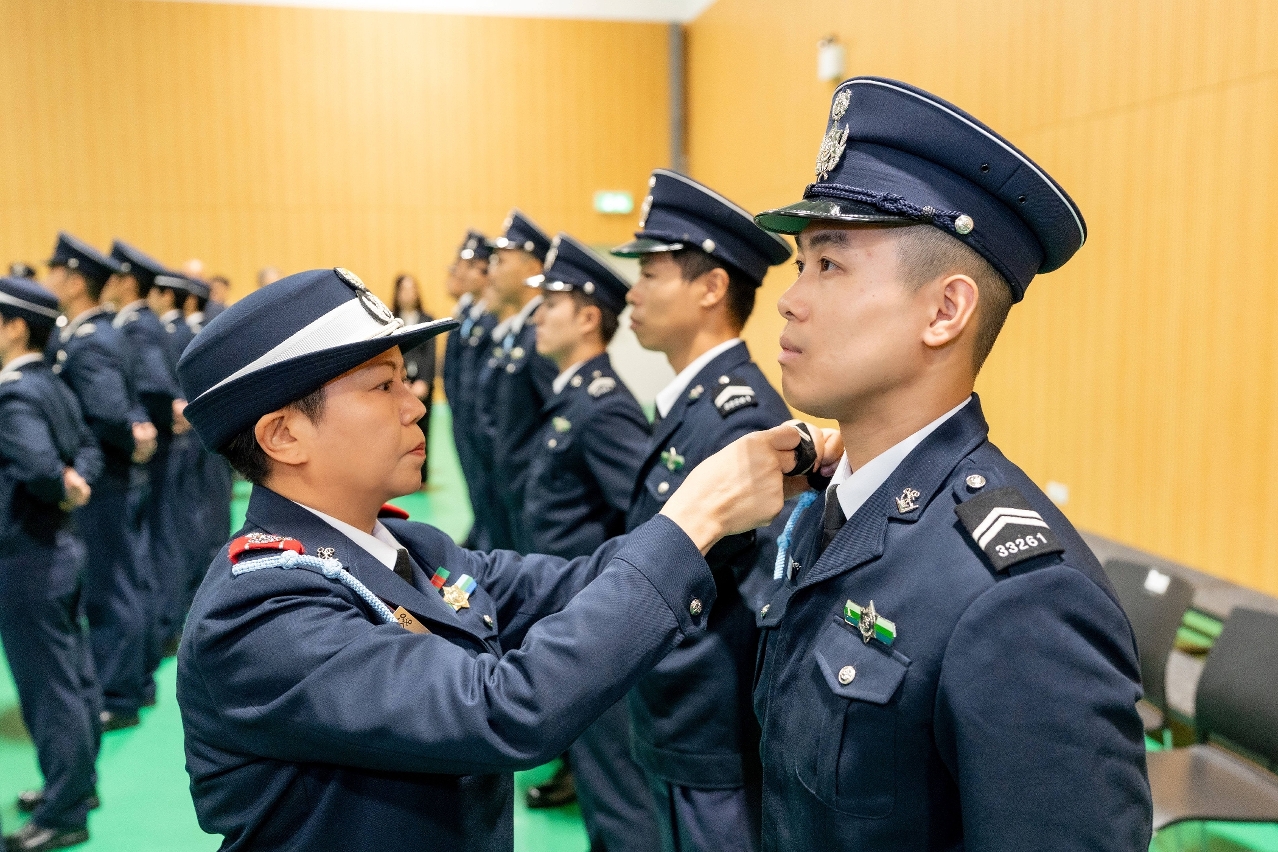 随后,李煜辉、助理关长叶华钊及吴嘉慧为新入职关员佩戴肩章,并向是次培训课程获得总成绩优异奖的林思庄颁发了奖项。就职仪式结束后,毕业学员随即被分派至海关各单位执勤,正式履行职责。