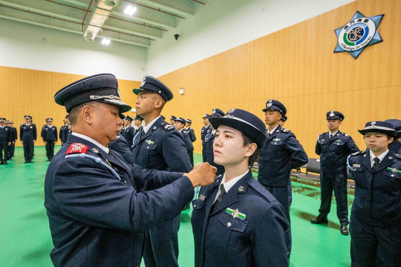 澳门海关今(16)日在海关总部为新入职关员举行就职仪式,由副关长李煜辉主持。完成是届培训课程并毕业的学员共有38人,分别为26名男学员和12名女学员,当中31人具备学士或以上学历。